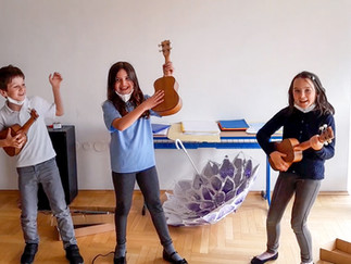 Middle Primary playing ukuleles, with a song battle where students made up songs for their team